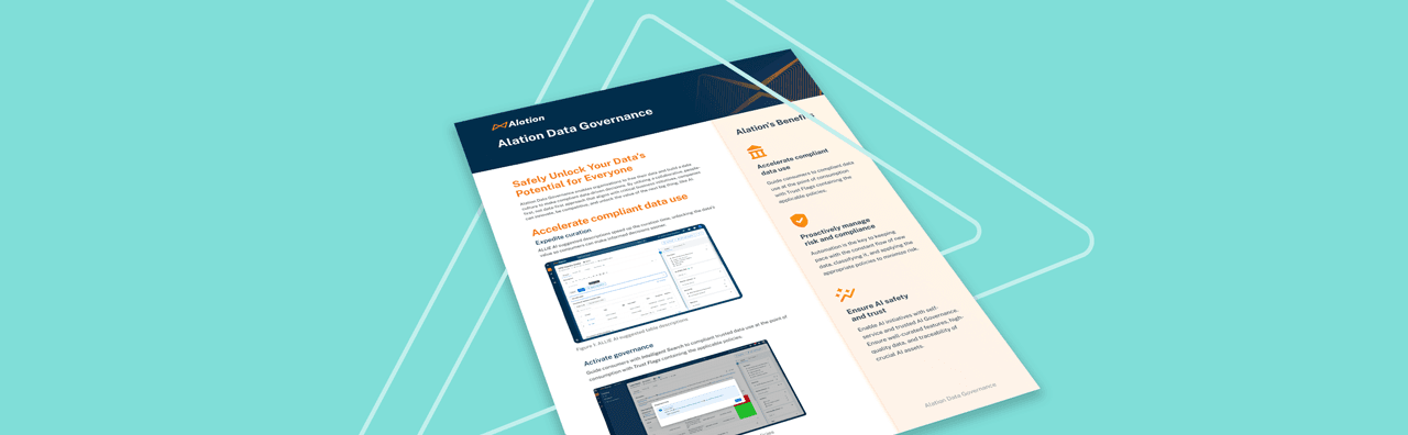 Alation Data Governance provides the ability to establish and sustain governance programs to centralize data assets’ metadata to remove silos, reduce compliance risk through policies, standards, and controls for those assets, and unlock an organization's data safely for everyone by guiding people to trusted, high-quality, and governed data to make compliant data-driven decisions.